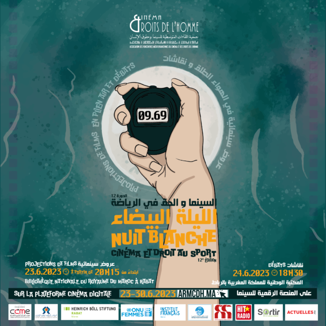 La 12ème édition de la Nuit Blanche Cinéma et Droit au Sport a été marquée par un débat qui s’est tenu à l’auditorium de la Bibliothèque Nationale du Royaume du Maroc. Le débat a eu lieu le samedi 24 juin 2023, de 18h30 à 20h30, après une nuit de projections de 7 films inspirants sur le sport et les droits humains